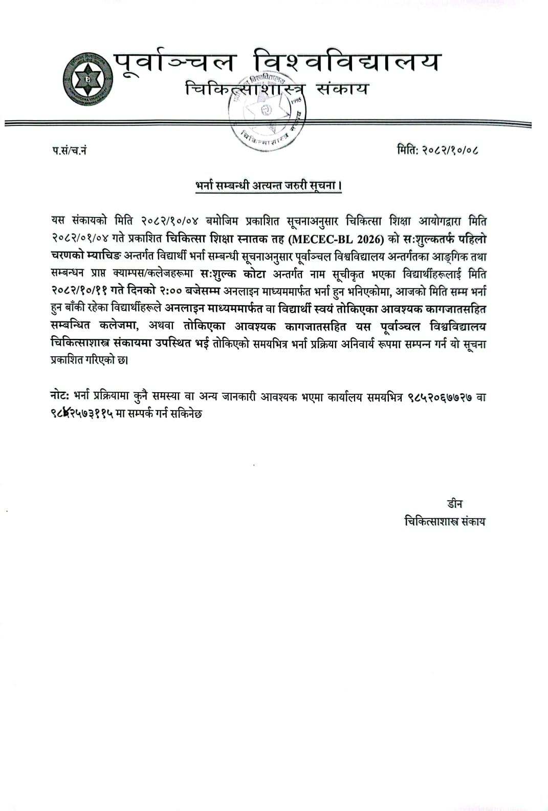 छात्रवृति कोटा अन्तर्गतको Second Re-Matching (MECEE-UG 2026) भर्ना सम्बन्धी अत्यन्त जरुरी सूचना